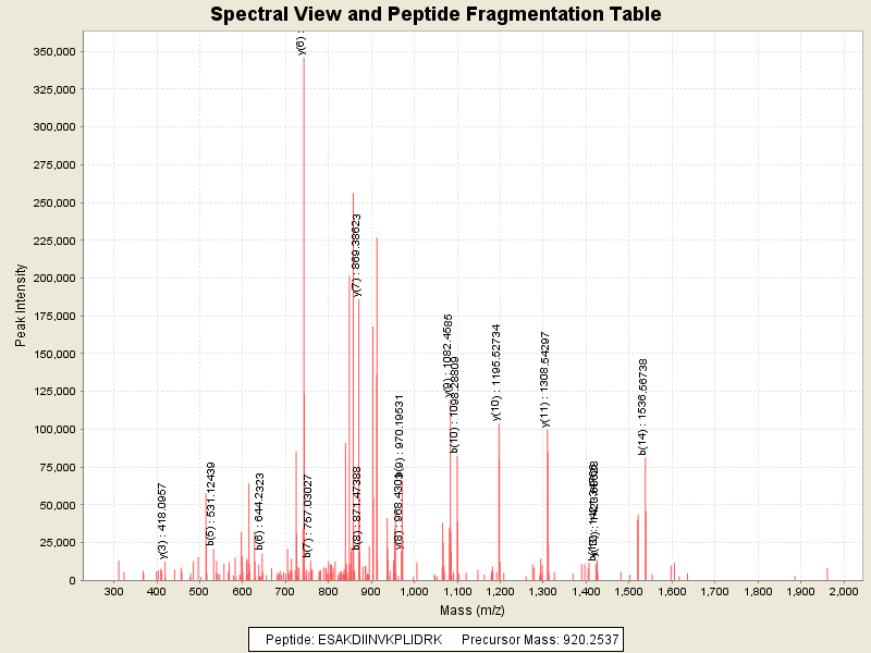 Observed mass of peptide: 920.2536621094, (+2)