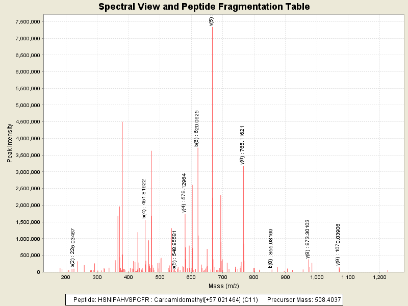 MS/MS Fragmentation of: HSNIPAHVSPCFR : Carbamidomethyl[+57.021464] (C11)