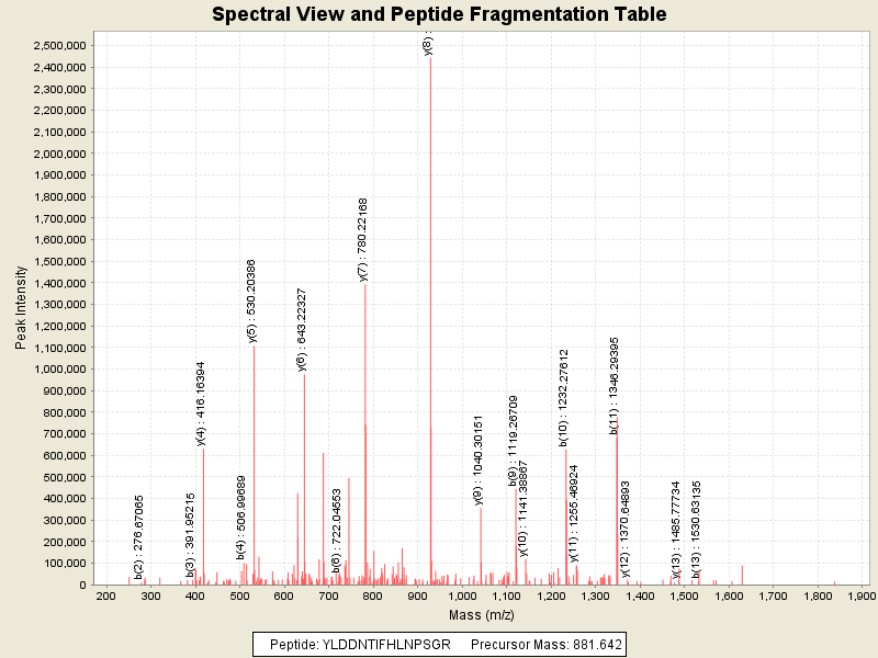 Observed mass of peptide: 881.6419677734, (+2)