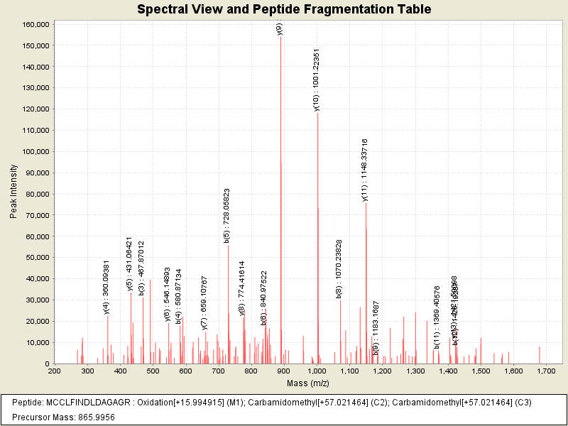 Observed mass of peptide: 865.9956054688, (+2)