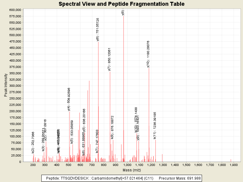 Observed mass of peptide: 691.9880371094, (+2)