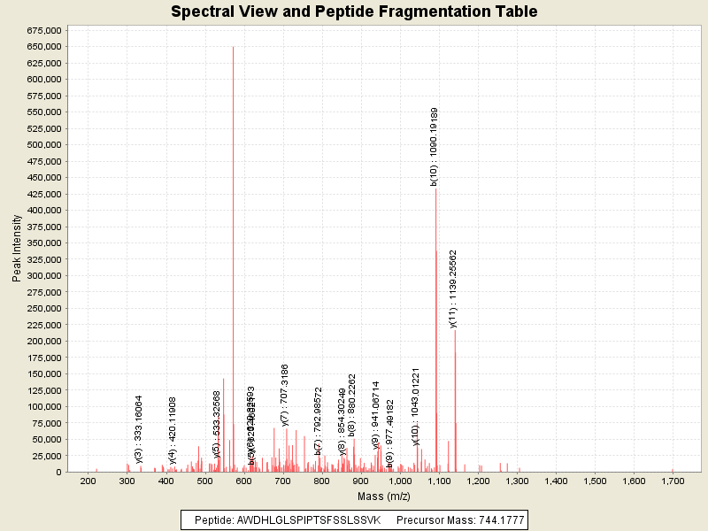 Observed mass of peptide: 744.177734375, (+3)
