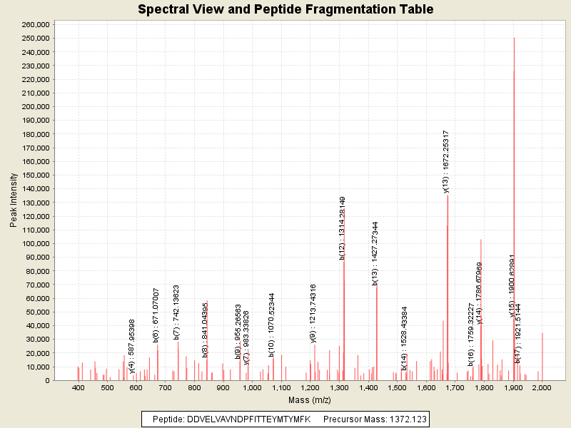 Observed mass of peptide: 1372.123046875, (+2)