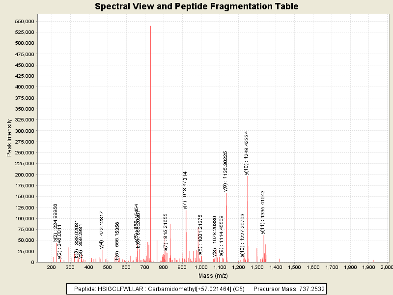 Observed intensity of peptide: 3326590.0