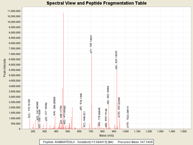 MS/MS Fragmentation of: AVAMSATEGLK : Oxidation[+15.994915] (M4)