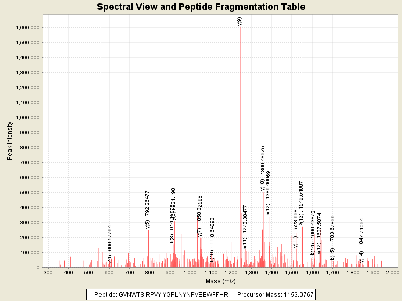 Observed mass of peptide: 1153.0766601562, (+3)