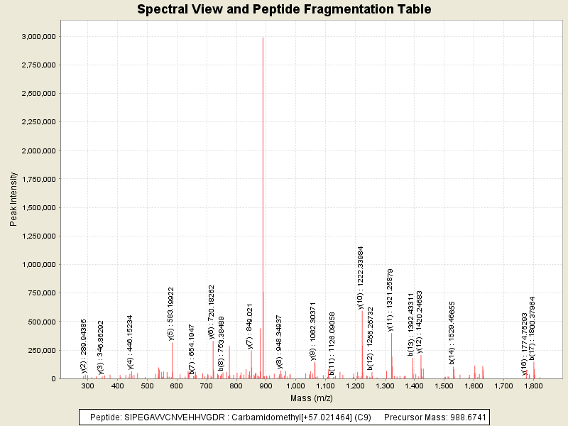 Observed mass of peptide: 988.6740722656, (+2)