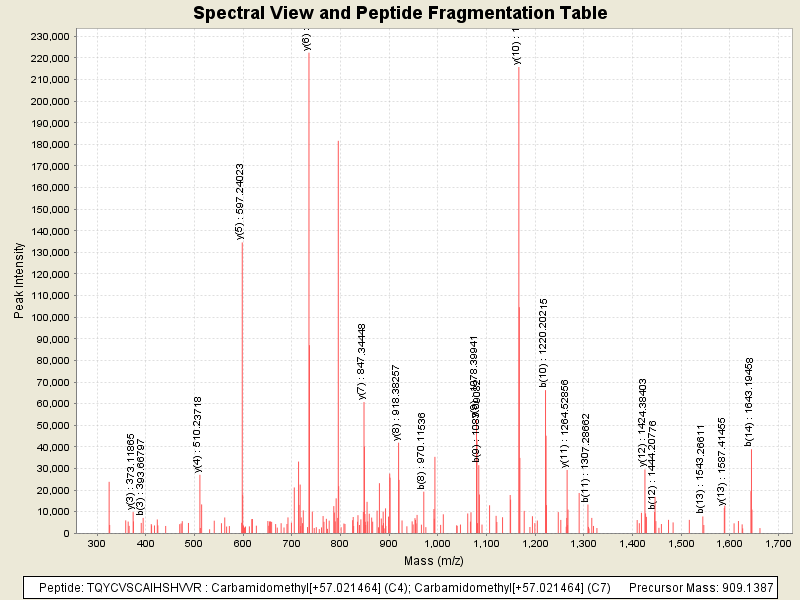 MS/MS Fragmentation of: TQYCVSCAIHSHVVR : Carbamidomethyl[+57.021464] (C4); Carbamidomethyl[+57.021464] (C7)
